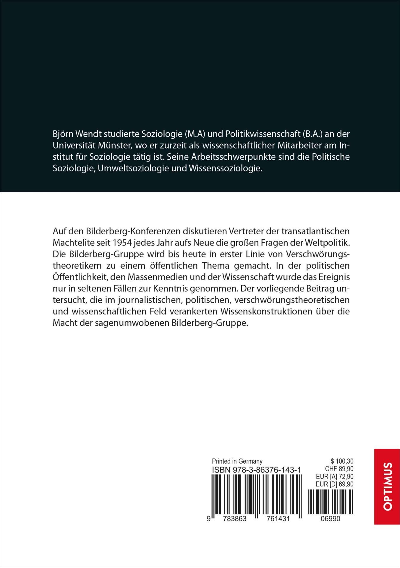 Wie man sich dem verschwiegenen Thema aus sozialwissenschaftlicher Perspektive annähert, führt Björn Wendt in seiner Studienarbeit „Die Bilderberg-Gruppe – Wissen um die Macht gesellschaftlicher Eliten“ vor. Während es der Berichterstattung an Objektivität und Transparenz fehlt, unternimmt der studierte Soziologe den seltenen Versuch einer theoretisch und methodisch fundierten Untersuchung. Mit ruhiger und wohlinformierter Stimme bewegt er sich in dem Spannungsfeld des gesellschaftlichen Diskurses über die Macht der Elite-Gruppe. Die Frage, wie Journalisten, Politiker und Verschwörungstheoretiker ihr Wissen über die Macht der Bilderberg-Gruppe konstruieren, bildet dabei den Kernpunkt in Wendts Arbeit. Ausgehend von einem Gerüst aus klassischen, marxistischen und pluralistischen Elitetheorien nähert sich Björn Wendt seiner Fragestellung, indem er zahlreiche Dokumente und Daten heranzieht: Angefangen bei journalistischen Beiträgen über politische Stellungnahmen bis hin zu verschwörungstheoretischem Material erfolgt eine empirisch qualitative Sichtung der öffentlichen Erzeugnisse. Diese Differenzierung erlaubt es dem Autor, spezifische Zensurmechanismen der unterschiedlichen Akteursgruppen hinsichtlich ihrer Berichterstattung aufzudecken. Seine Ergebnisse ergänzt Björn Wendt abschließend durch die Betrachtung des wissenschaftlichen Feldes. Dabei gewährt der Autor dem interessierten Leser tiefe Einblicke in bisher vernachlässigte Quellen zur Organisationsstruktur, Finanzierung und Rekrutierung sowie zu Ablauf und Themen der Bilderberg-Konferenzen. Auch auf eine vollständige Auflistung ihrer Mitglieder von den Anfängen bis zum Jahr 2012 wird nicht verzichtet.