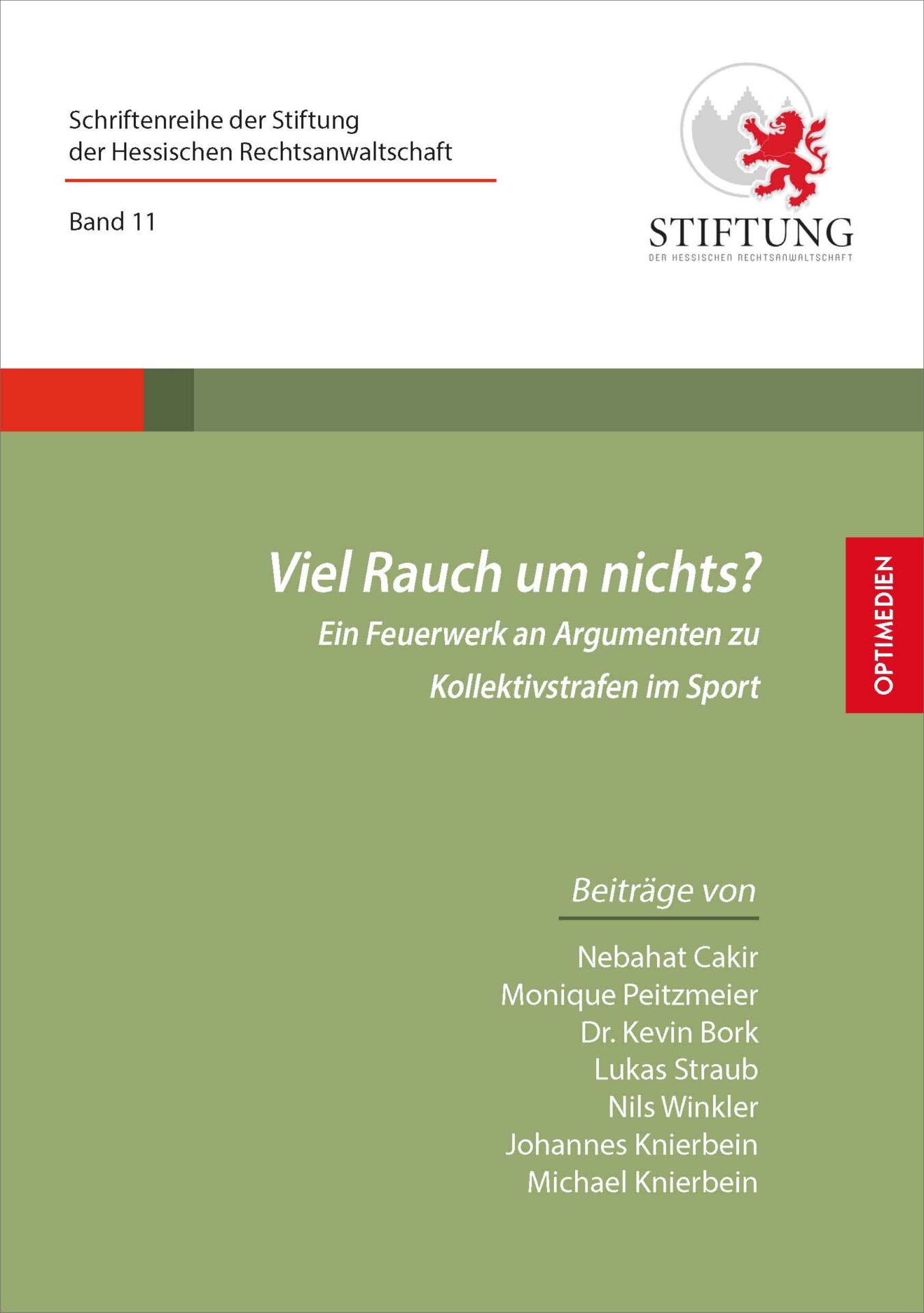 Der 11. Band der Schriftenreihe der Stiftung der Hessischen Rechtsanwaltschaft widmet sich dem rechtlich und gesellschaftlich hochaktuellen Thema der Kollektivstrafen im Sport. Unter dem Titel „Viel Rauch um nichts? Ein Feuerwerk an Argumenten zu Kollektivstrafen im Sport“ analysieren die im Rahmen eines bundesweiten studentischen Aufsatzwettbewerbs ausgezeichneten Beiträge die Frage, inwieweit Vereine für das Verhalten einzelner Fans haftbar gemacht werden können – etwa bei Verstößen durch das Abbrennen von Pyrotechnik oder anderen sicherheitsrelevanten Vorfällen in Stadien.
