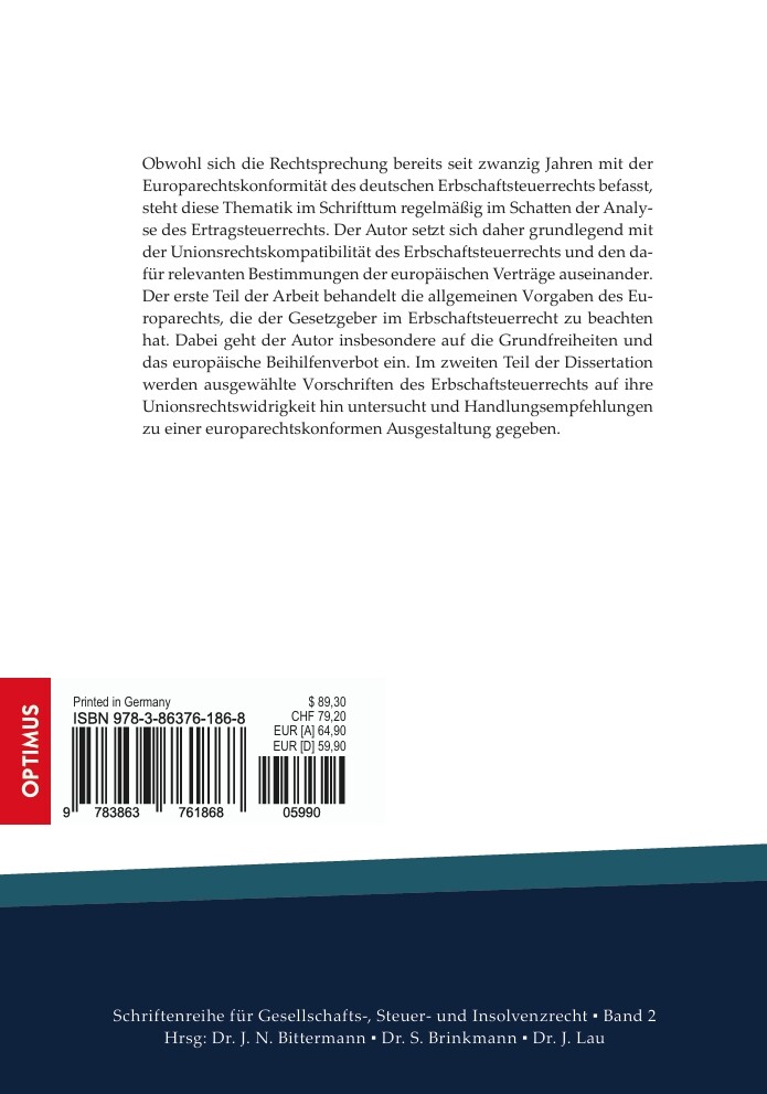 Obwohl sich die Rechtsprechung bereits seit zwanzig Jahren mit der Europarechtskonformität des deutschen Erbschaftsteuerrechts befasst, steht diese Thematik im Schrifttum regelmäßig im Schatten der Analyse des Ertragsteuerrechts. Der Autor setzt sich daher grundlegend mit der Unionsrechtskompatibilität des Erbschaftsteuerrechts und den dafür relevanten Bestimmungen der europäischen Verträge auseinander. Der erste Teil der Arbeit behandelt die allgemeinen Vorgaben des Europarechts, die der Gesetzgeber im Erbschaftsteuerrecht zu beachten hat. Dabei geht der Autor insbesondere auf die Grundfreiheiten und das europäische Beihilfenverbot ein. Im zweiten Teil der Dissertation werden ausgewählte Vorschriften des Erbschaftsteuerrechts auf ihre Unionsrechtswidrigkeit hin untersucht und Handlungsempfehlungen zu einer europarechtskonformen Ausgestaltung gegeben.