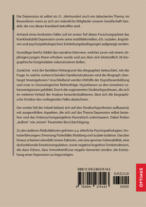Die Arbeit analysiert anhand eines narrativen Interviews mit einem 26-jährigen Mann die multifaktoriellen Entstehungsbedingungen von Depression unter besonderer Berücksichtigung geschlechtsspezifischer Tabuisierung. Im Mittelpunkt stehen die biographische Rekonstruktion familiärer, sozialer und psychischer Einflussfaktoren sowie eine theoriebasierte Auswertung strukturbildender Risikoparameter im Kontext depressiver Entwicklungen.