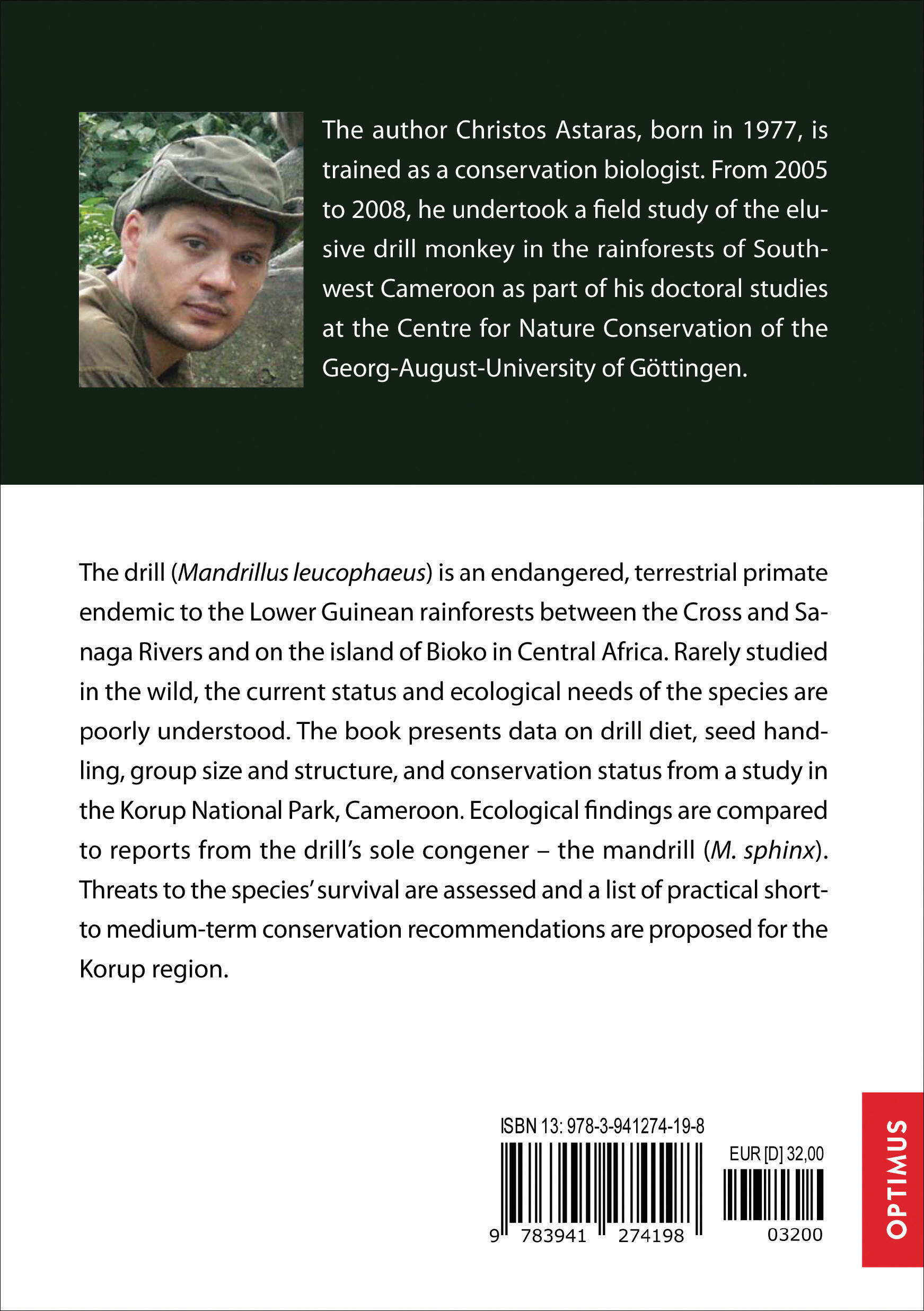 The drill (Mandrillus leucophaeus) is an endangered, terrestrial primate endemic to the Lower Guinean rainforests between the Cross and Sanaga Rivers and on the island of Bioko in Central Africa. Rarely studied in the wild, the current status and ecological needs of the species are poorly understood. The book presents data on drill diet, seed handling, group size and structure, and conservation status from a study in the Korup National Park, Cameroon. Ecological findings are compared to reports from the drill’s sole congener – the mandrill (M. sphinx). Threats to the species’ survival are assessed and a list of practical shortto medium-term conservation recommendations are proposed for the Korup region.