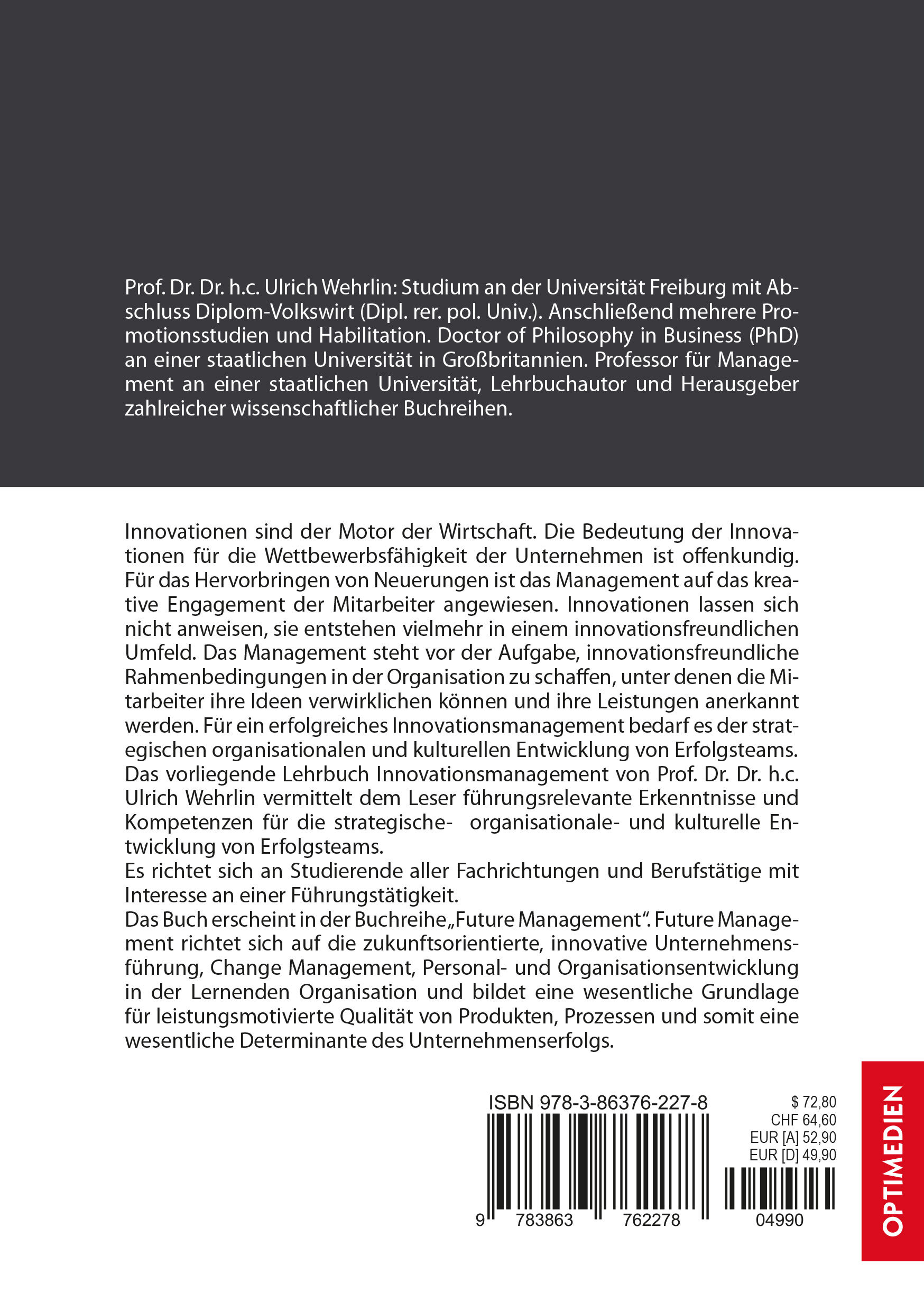 Adressiert werden Studierende aller Fachrichtungen und Berufstätige mit Führungsverantwortung oder -ambition. Eingebettet in die Reihe „Future Management“ (zukunftsorientierte Unternehmensführung, Change-Management, Personal- und Organisationsentwicklung in der Lernenden Organisation) bietet der Band ein wissenschaftlich fundiertes, zugleich praxisnahes Konzept des Innovationsmanagements, das Produkt- und Prozessqualität stärkt und damit langfristig zum Unternehmenserfolg beiträgt.