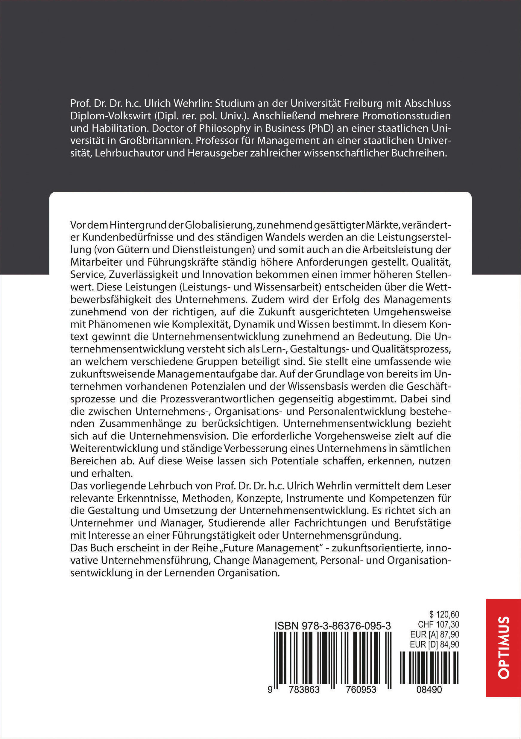 Das vorliegende Lehrbuch von Prof. Dr. Dr. h.c. Ulrich Wehrlin vermittelt dem Leser relevante Erkenntnisse, Methoden, Konzepte, Instrumente und Kompetenzen für die Gestaltung und Umsetzung der Unternehmensentwicklung. Es richtet sich an Unternehmer und Manager, Studierende aller Fachrichtungen und Berufstätige mit Interesse an einer Führungstätigkeit oder Unternehmensgründung.