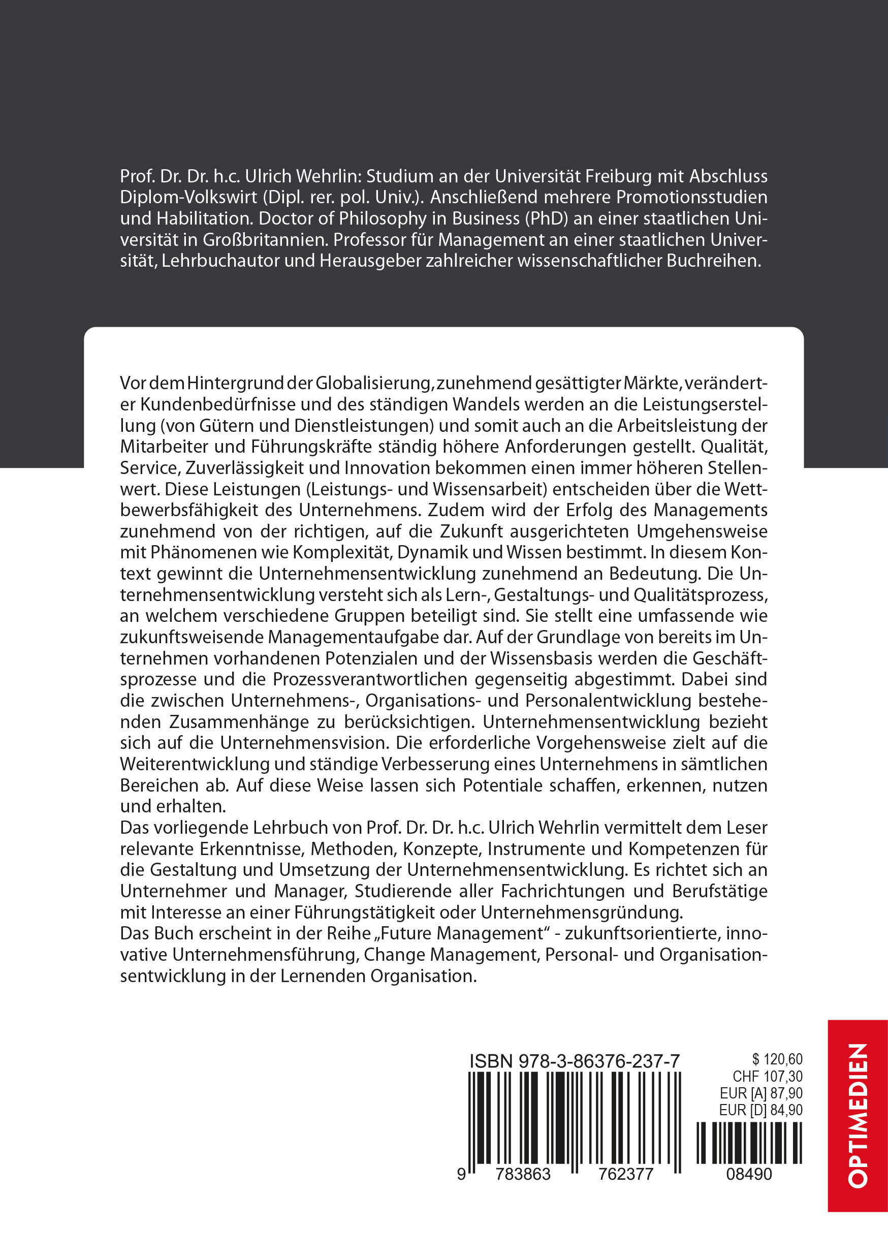 Das vorliegende Lehrbuch von Prof. Dr. Dr. h.c. Ulrich Wehrlin vermittelt dem Leser relevante Erkenntnisse, Methoden, Konzepte, Instrumente und Kompetenzen für die Gestaltung und Umsetzung der Unternehmensentwicklung. Es richtet sich an Unternehmer und Manager, Studierende aller Fachrichtungen und Berufstätige mit Interesse an einer Führungstätigkeit oder Unternehmensgründung. Das Buch erscheint in der Reihe "Future Management" ? zukunftsorientierte, innovative Unternehmensführung, Change Management, Personal- und Organisationsentwicklung in der Lernenden Organisation.