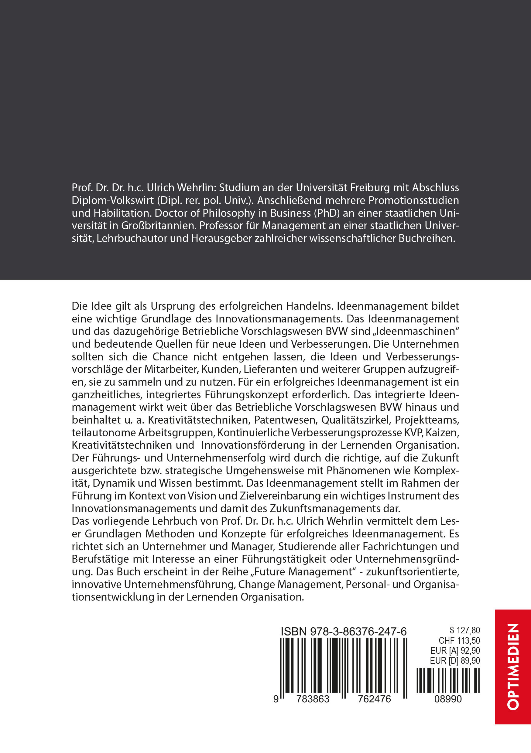 Das vorliegende Lehrbuch von Prof. Dr. Dr. h.c. Ulrich Wehrlin vermittelt dem Leser Grundlagen Methoden und Konzepte für erfolgreiches Ideenmanagement. Es richtet sich an Unternehmer und Manager, Studierende aller Fachrichtungen und Berufstätige mit Interesse an einer Führungstätigkeit oder Unternehmensgründung.