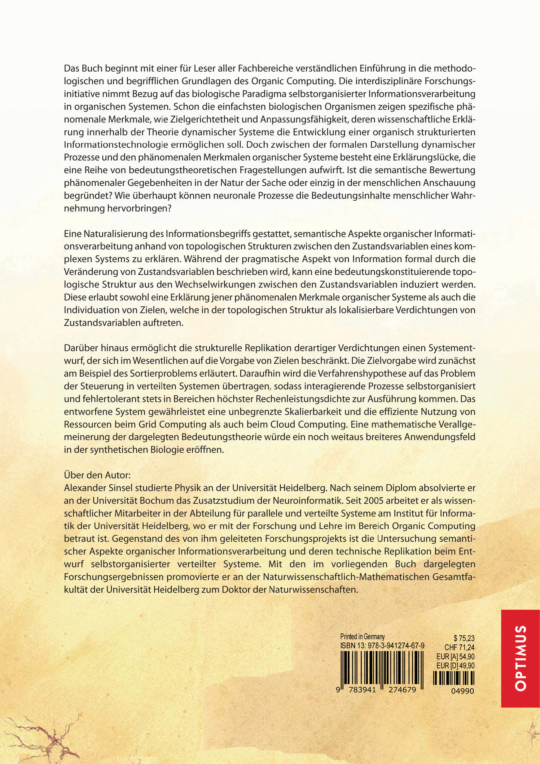 Darüber hinaus ermöglicht die strukturelle Replikation derartiger Verdichtungen einen Systementwurf, der sich im Wesentlichen auf die Vorgabe von Zielen beschränkt. Die Zielvorgabe des Organic Computing wird zunächst am Beispiel des Sortierproblems erläutert. Daraufhin wird die Verfahrenshypothese auf das Problem der Steuerung in verteilten Systemen übertragen, sodass interagierende Prozesse selbstorganisiert und fehlertolerant stets in Bereichen höchster Rechenleistungsdichte zur Ausführung kommen. Das entworfene System gewährleistet eine unbegrenzte Skalierbarkeit und die effiziente Nutzung von Ressourcen beim Grid Computing als auch beim Cloud Computing. Eine mathematische Verallgemeinerung der dargelegten Bedeutungstheorie würde ein noch weitaus breiteres Anwendungsfeld in der synthetischen Biologie eröffnen.